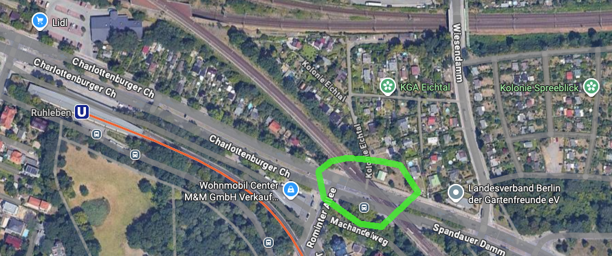 Prometo también hacer trabajo de campo y buscar el lugar exacto que representa la imagen. Por el puente del ferrocarril yo diría que, si la ruta del tranvía 54 es la que hace ahora el M45, solo puede tratarse de este punto cerca de Ruhleben:
