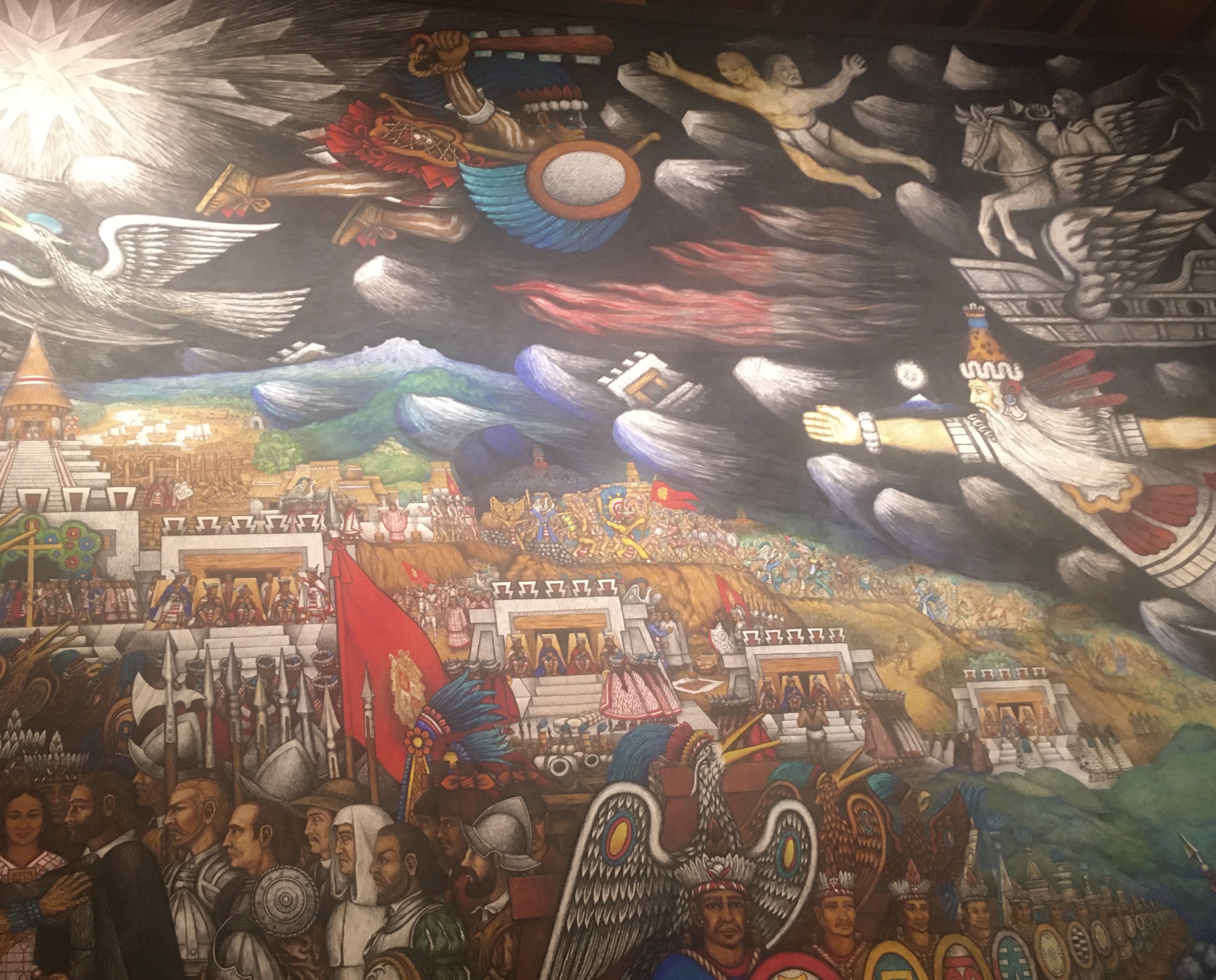 Por las mismas razones no me dejaron entrar en el palacio de Gobierno a la primera. Y es que en el palacio de Gobierno están las pinturas murales de Desiderio Hernández Xochitiotzin, un monumental programa pictográfico del muralismo mexicano de la segunda ola. Posible, secreta, calladamente, querer ver estos murales fue lo que motivó mi experiencia trasatlántica: todo lo demás, y fue mucho, se engarzó orgánicamante a ese hilo como cuando crecen los cristales.