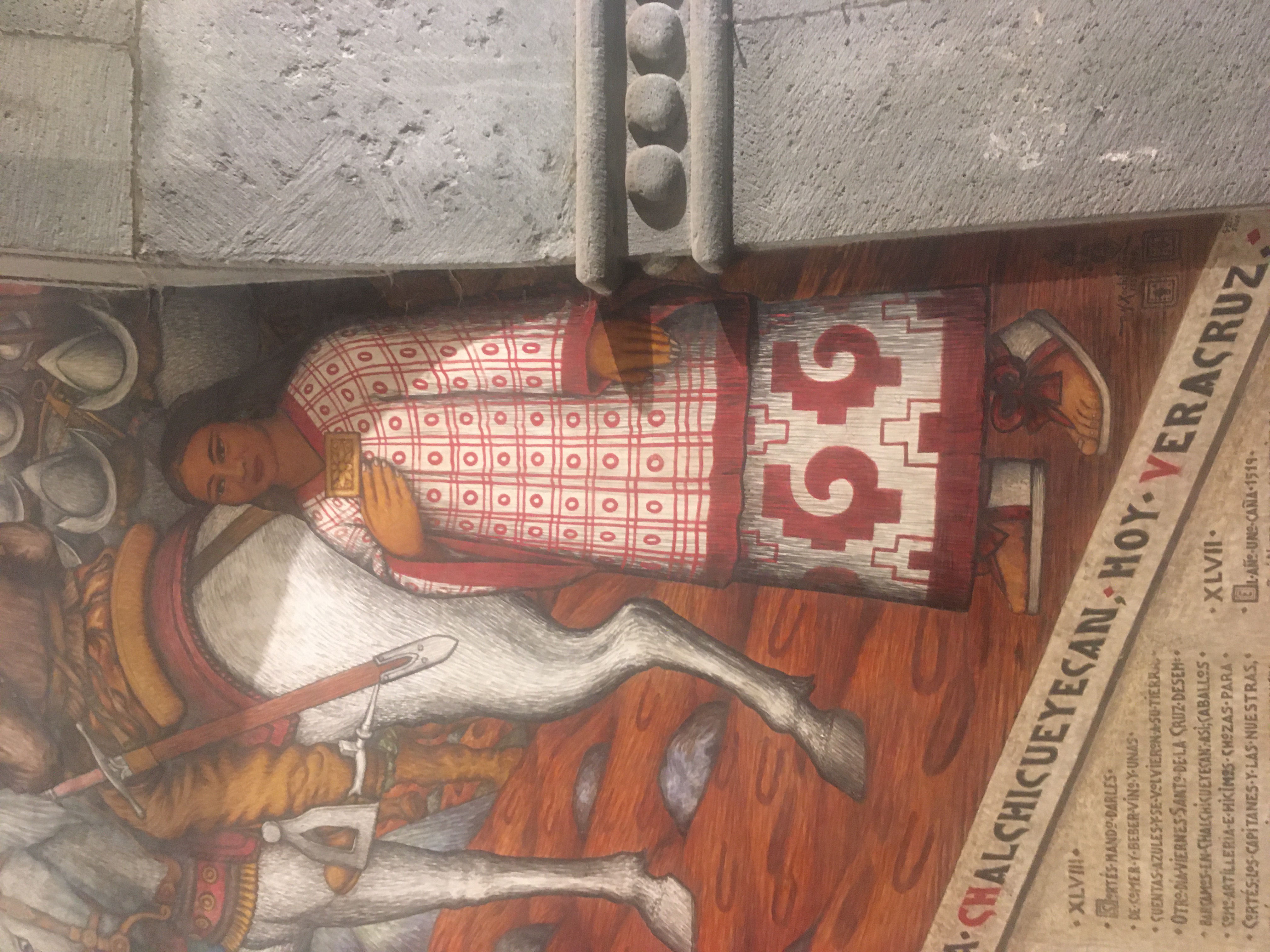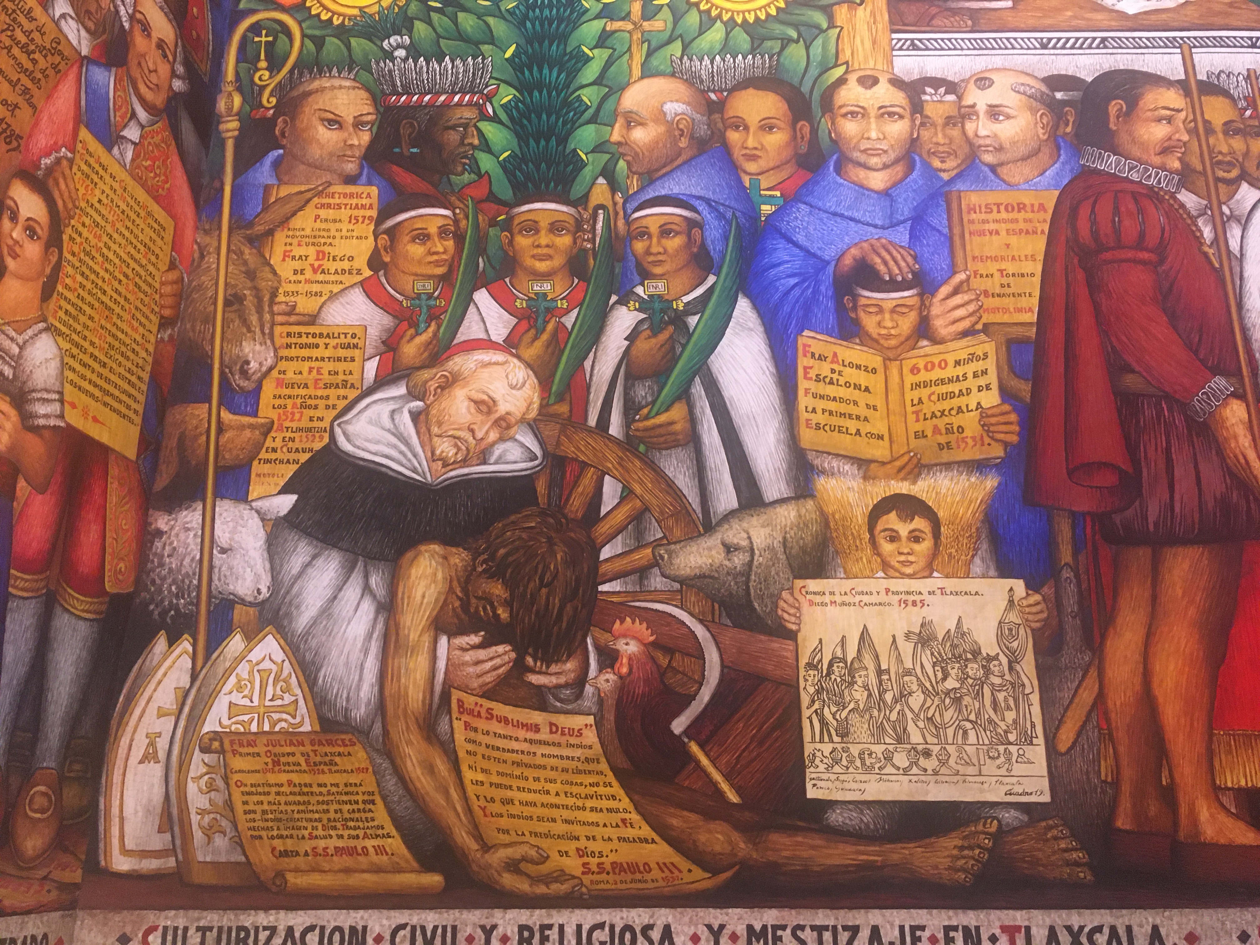Y cómo aterricé en estos murales de Tlaxcala? Documentándome sobre la Malinche para terminar el grado. Aunque el seminario trataba de la Revolución Mexicana, yo barrí para casa, intentando hablar de política lingüística (Habsburgo vs. Borbones) y relatos fundacionales y traducción como mediación política y vuelta a las minorías lingüísticas y qué se yo qué más. Tanto la presentación en clase como el correspondiente trabajo parcial fueron soberanos batiburrillos. Te lo resumo así no más. La Marina/Malintzin que ves en las imágenes, y que es central en todo el programa (a pesar de no ser tlaxcalteca!) tiene mucho de surda Talía: una figura ubicua y psicopomposa que, siendo la única que establece contacto visual con el espectador, lo introduce en el relato y lo guía a través del proceso de conocimiento. Es un (mero?) vehículo para establecer la intersubjetividad? El caso es que en su neutralidad, por ser contemplativa, casi aséptica, quizás sea esta la visión más honesta y justa con el personaje de cuantas han habido (o, al menos, yo conozco). Porque la Malinche ha sido secular y mecánicamente instrumentalizada, codificada y recodificada, de acuerdo a las intenciones o a la sensibilidad del momento: a veces figura mística (madre ubérrima y doliente del mestizaje, como la de Orozco) y a veces asquerosamente pragmática, como la histérica que grita desde la terraza del palacio en la crónica que ahora no recuerdo. Que Malinche tiene mucho de Medea, sin saberlo seguramente quien así la transmitió. Su carácter mariano es mucho más evidente.