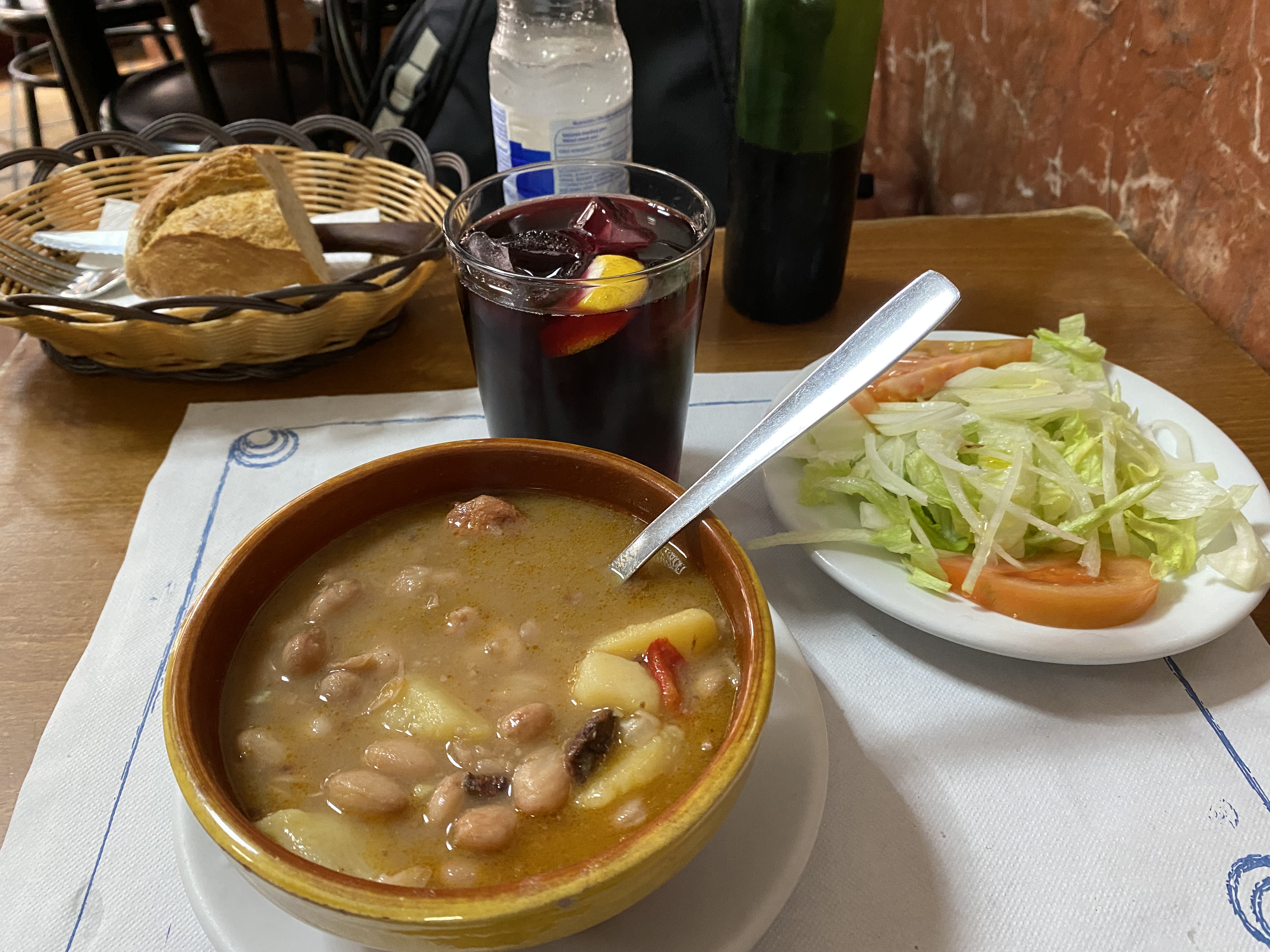 Por eso me agarro a lo que todavía funciona. Y no sé qué día de los que estuve por allá comí el menú del día en El Jamón de Lavapiés (nombre ficticio: no quiero que se vuelva de repente popular). Iba hace veinte años bastante y no ha cambiado demasiado: ni en decoración, ni en calidad ni en paisanaje. El dicho menú son ahora 12,90, y este fue el primer plato.