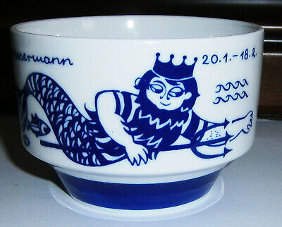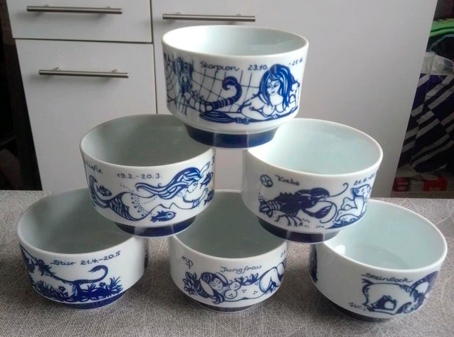 Cuando empecé a reunir cosas para la nueva casa (me faltaba todo) me dio por la porcelana de la DDR, en particular por un estilo que se llama de muchas maneras: Indisches Blau, Zwiebelmuster… En alemán hay muchas maneras de llamar a las mismas cosas, lo que hace que sea muy difícil localizarlas por ejemplo en Kleinanzeigen (el Wallapop local). Ya os hablé de esto. El caso es que i) ahora tengo una caja llena de vajilla de porcelana preciosa que no uso pero ii) conseguí de casualidad un cuenco decorado con dos motivos del zodíaco y figuras femeninas en actitud erótico-festiva. Se dan un aire a los dibujos de Mingote. Ese primer cuenco lo conseguí en Schmargendorf, una barriada noble de Berlín muy mal comunicada, de manos de una chica queer que también ofrecía artículos antifas. Se trataba del que trae Zwillinge (vaya par de gemelas!) y Stier, Tauro; y me costó un euro o dos.